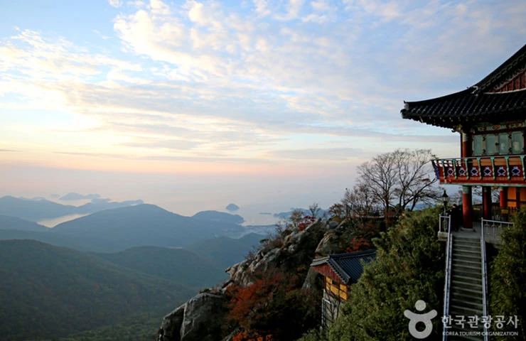 소금강 또는 남해금강이라 불리는 삼남 제일의 명산. 금산(704m)은 한려해상국립공원의 유일한 산악공원으로 온통 기암괴석들로 뒤덮인 38경이 절경을 이루고 있다. 신라 원효대사가 이 산에 보광사를 짓고 보광산이라 불러왔는데, 조선 태조 이성계가 젊은 시절 이 산에서 백일기도 끝에 조선왕조를 개국하게 되자 영세불망의 영산이라 하여 온 산을 비단으로 두른다는 뜻으로 금산으로 이름을 바꿨다고 한다. 정상에는 강화도 보문사, 낙산사 홍련암과 더불어 우리나라 3대 기도처의 하나인 보리암이 있으며, 불타오르는 여명이 바다에서 솟구쳐 오르는 금산의 일출은 3년동안 덕을 쌓아 볼수 있다하며 그 장엄함이 이루 말로 표현할 수 없는 환희를 가져다 준다.